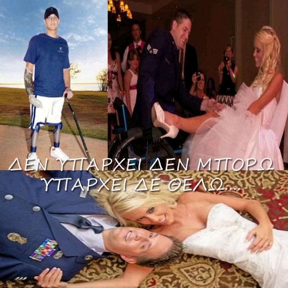 | Δεν υπάρχει δεν μπορώ, υπάρχει δε θέλω Posted: 21 May 2012 03:20 PM PDT Όταν ο Μπράιαν Κόλφατζ έχασε τα πόδια και το δεξί του χέρι σε επίθεση στο Ιράκ, κανείς δεν ήταν ιδιαίτερα αισιόδοξος για το μέλλον. Πέρασε οκτώ ώρες στο χειρουργείο και οι στρατιωτικοί γιατροί προετοιμάζονταν για το χειρότερο. Ήταν μόλις 22 χρονών! Όμως....... οκτώ χρόνια αργότερα, ο 30χρονος πλέον Μπράιαν όχι μόνο ζει αλλά ζει μία φυσιολογική ζωή. Παντρεύτηκε και σπουδάζει για να πάρει το πτυχίο του στην αρχιτεκτονική στο Πανεπιστήμιο της Αριζόνα. Ο Μπράιν Κόλφατζ θυμάται την ημέρα που του άλλαξε τη ζωή... Ήταν ένα βλήμα των 107 χιλιοστών. Η έκρηξη διέλυσε τα πόδια του και τραυμάτισε σοβαρά το δεξί του χέρι... «Προσπάθησα να σταθώ αλλά δεν δούλευε τίποτα», θυμάται, «νόμιζα πως ονειρευόμουν». Κατά την ανάρρωση ο Μπράιαν έμαθε να γράφει με το αριστερό του χέρι- αφού δεν είχε πια το δεξί. Τελικά έβαλε ένα προσθετικό δεξί χέρι και πόδια που του επέτρεπαν να περπατά, έστω και επώδυνα. Στη συνέχεια μετακόμισε στην Αριζόνα και επικοινώνησε με μία κοπέλα που φλέρταρε παλιά, την Άσλει Γκόουτζ που είχε συναντήσει όταν το στράτευμα του στάθμευε στο Τέξας. Την εντόπισε στο Facebook το 2009 και άρχισαν να επικοινωνούν. Ωστόσο η κοπέλα τον απέρριψε καθώς βρισκόταν τότε σε σχέση. Όταν ξαναβρέθηκαν, όλα ήταν αλλιώς: «Ήταν μία άμεση σύνεση. Πάντα μου άρεσε και μου φαινόταν γλυκός», λέει η Άσλεϊ. Τον περασμένο Μάιο παντρεύτηκαν... η διαδρομη Κανε Like Αν σου αρεσε !! ΔΕΙΤΕ ΠΕΡΙΣΣΟΤΕΡΑ ΣΤΟ WWW.TSEKOURATOI.GR |